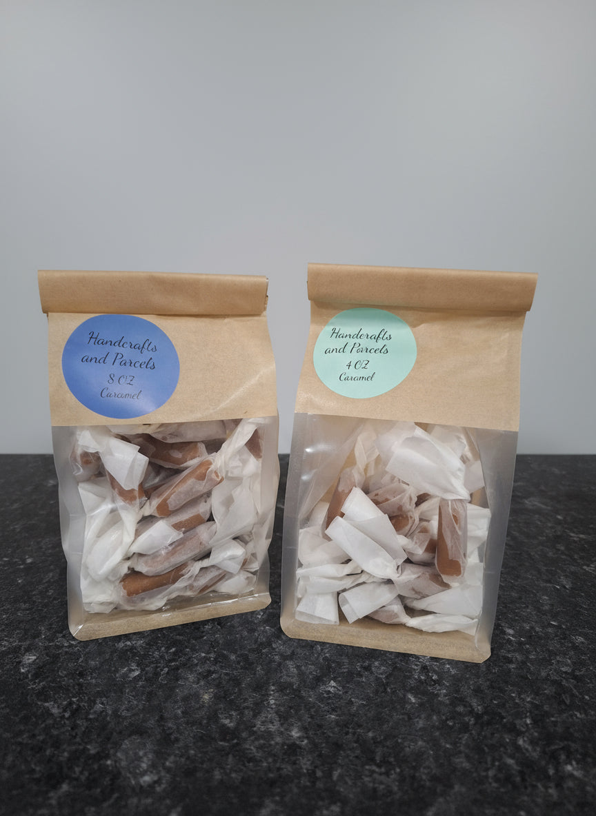 Homemade Caramel that is nice and gooey and soft. Perfect for eating or using in other desserts. It comes in two sizes, 4 ounces or 8 ounces. This makes it easy to share or keep them all to yourself. Want a taste? Come say "Hi" at the next craft fair and enjoy a sample.